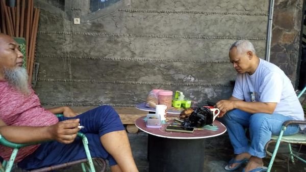 Setelah say hello sekian lama dan janjian ga pernah gathuk, akhirnya mengunjungi Muh Prastiyo (Cak Mad) di kota Kediri. Rumahnya demikian artistik dengan kebun di depannya menambah keasrian. Apalagi hari itu pas panas-panasnya, terasa mak nyes begitu nyampe di sini.
